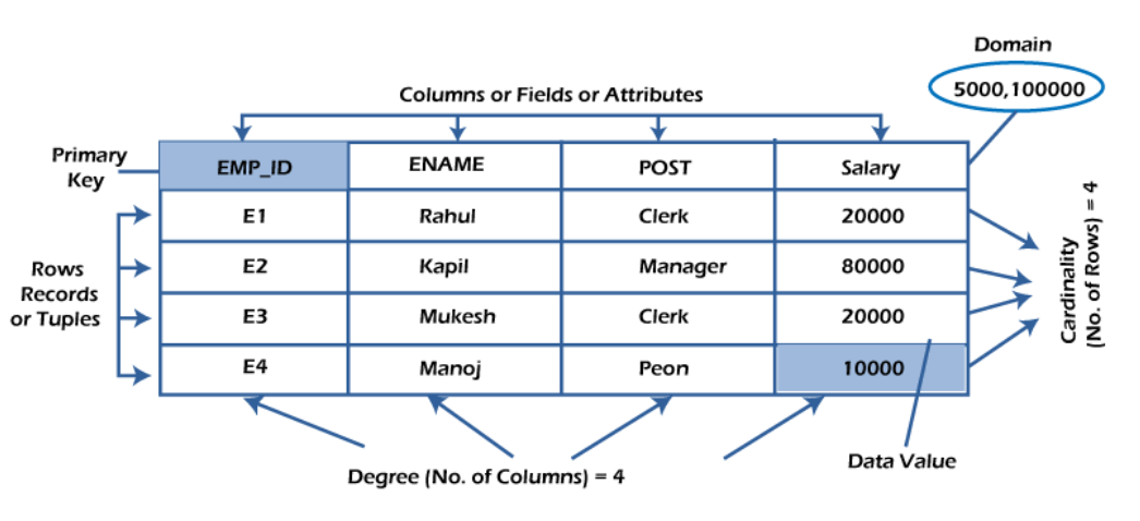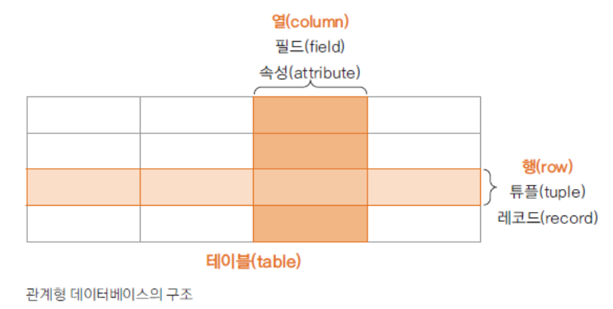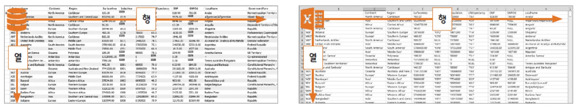 - 데이터는 행 단위로 저장되며, 각 항목의 속성은 열이라 표현함