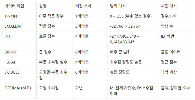 숫자 타입은 정수형(`INT`, `BIGINT`)과 실수형(`FLOAT`, `DOUBLE`)으로 구분됩니다.
