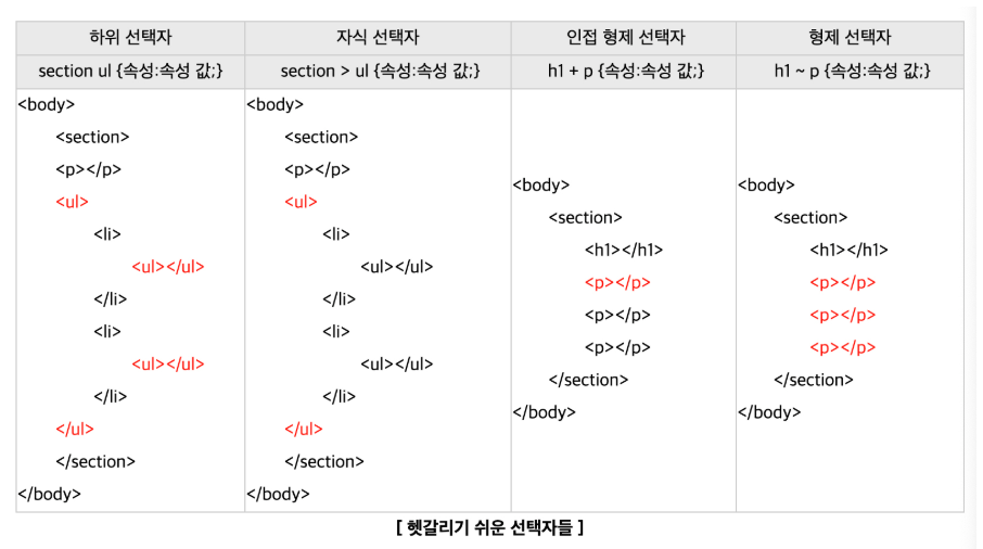 - 자손 선택자 ( <공백> ): 부모 안의 모든 자손(자식, 손자 등)을 선택. 자식 선택자 ( > ): 부모의 직계 자식만 선택. 인접 형제 선택자 ( + ): 바로 다음에 오는 형제 하나만 선택. 일반 형제 선택자 ( ~ ): 뒤에 오는 모든 형제를 선택.