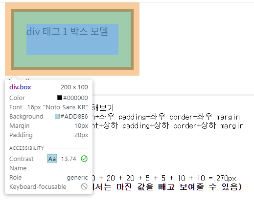 - 요소 자체의 너비: 200 + 40 + 10 = 250px