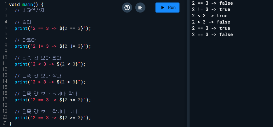두 개의 값을 비교하여 결과를 참 / 거짓 으로 반환하는 연산자 입니다.