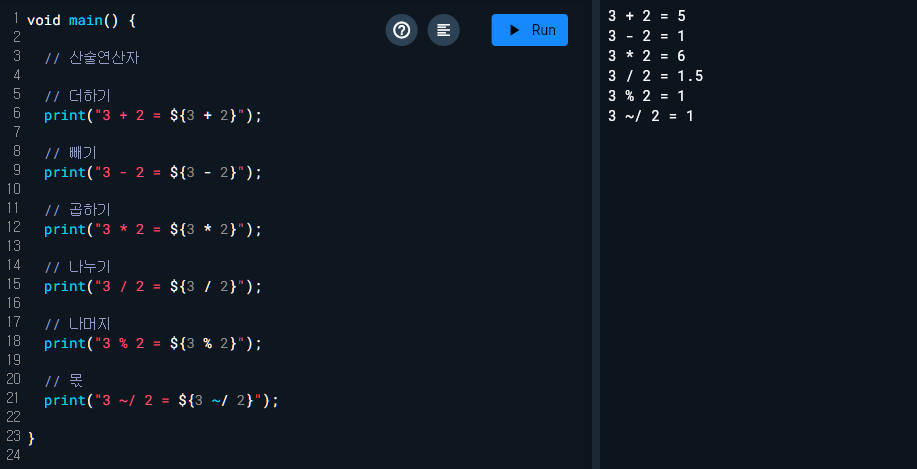 수학에서 사용하는 사칙 연산과 나머지 연산을 포함하는 연산자 입니다. Dart 에서는 몫을 구하는 연산자가 포함되어 있습니다.