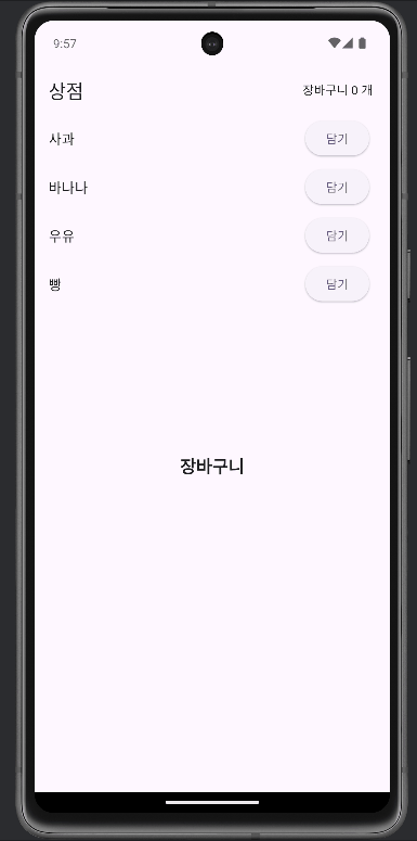 Center(child: Text('장바구니 ${cart.items.length} 개')),